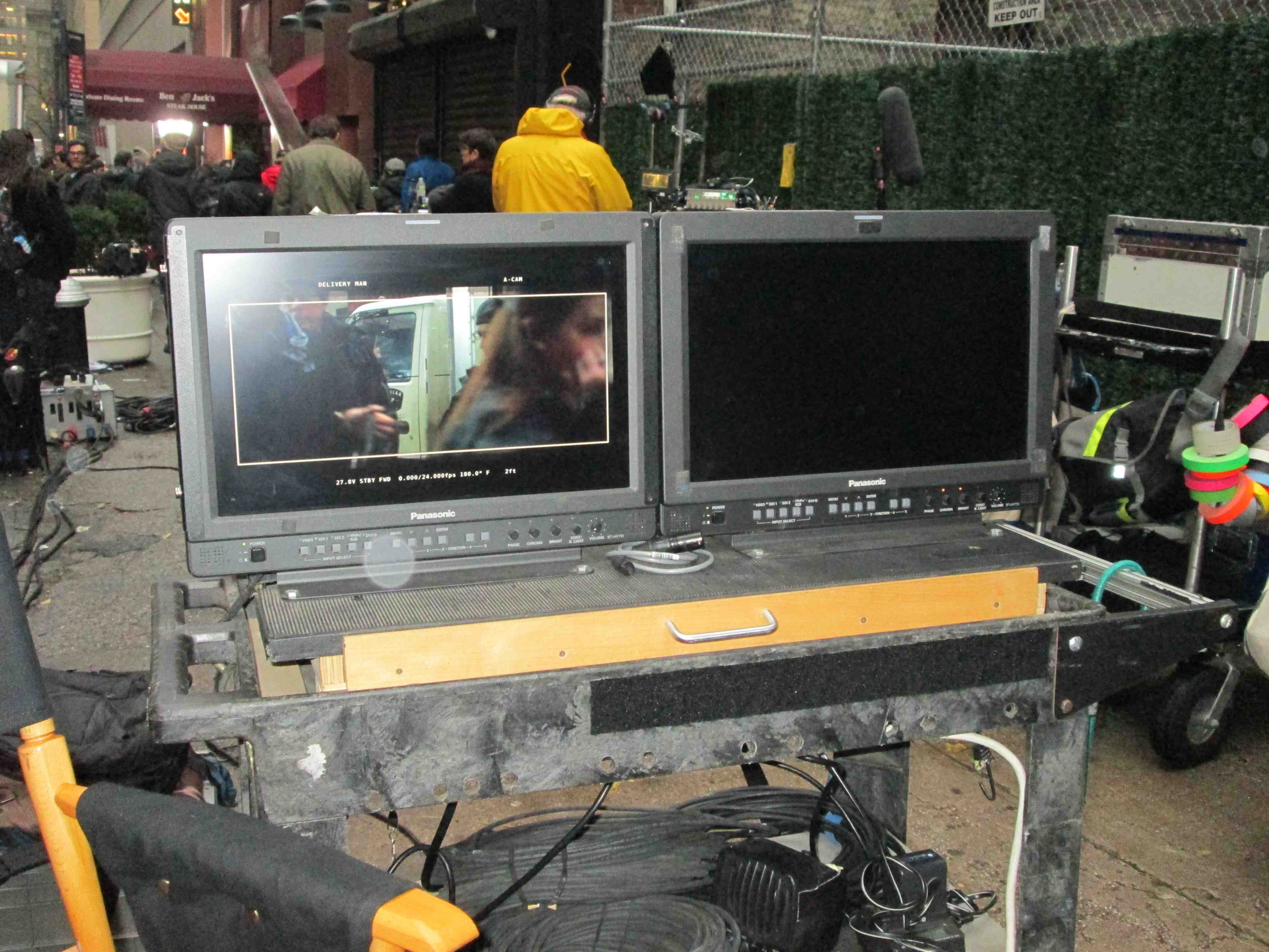 When we arrived at the set which was located on 47th Street between 2nd and Third Avenues, there were seats with headsets all set up which I thought was hilarious. Ten chairs lined up in front of a director’s chair and a monitor on a midtown side street. You can’t get any more New York, surreal and movie making all rolled into one.